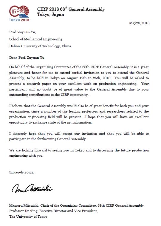应CIRP年会组织委员会邀请,我单位余祖元拟赴日本东京参加CIRP年会的学术会议。现将该团组拟出访情况公示如下: