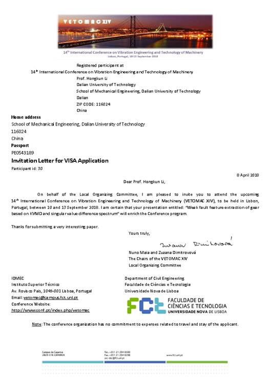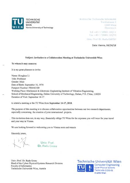 应Nuno Maia ,和 Zuzana Dimitrovová国际机械振动工程与技术会议主席、里斯本科技大学建筑工程系教授以及Dr. Radu Grosu维也纳工业大学教授、信息物理学院网络物理系统研究部主任的邀请,我单位李宏坤拟赴葡萄牙和奥地利参加学术会议并作学术访问。现将该团组拟出访情况公示如下: