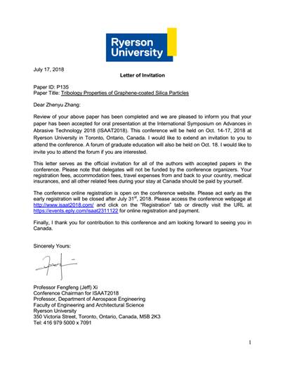 应 ISAAT2018大会主席FengFeng Xi 教授 邀请,我单位 张振宇 拟赴 加拿大 参加The International Symposium on Advances in Abrasive Technology(ISAAT2018)。现将该团组拟出访情况公示如下: