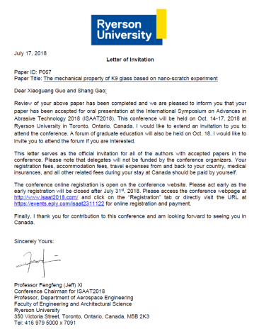 (1) The International Symposium on Advances in Abrasive Technology(ISAAT2018)(国际磨粒技术进展研讨会)在加拿大多伦多瑞尔森大学举行,会议由国际磨料技术委员会(ICAT)和日本磨料技术学会(JSAT)主办,多伦多瑞尔森大学承办。