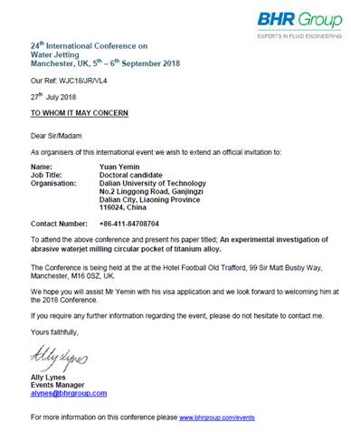 应第24届国际水射流会议会议组织人 Ally Lynes邀请,我单位 袁业民 拟赴 英国 曼彻斯特 国家(地区)进行工作访问(学术交流)。现将该团组拟出访情况公示如下: