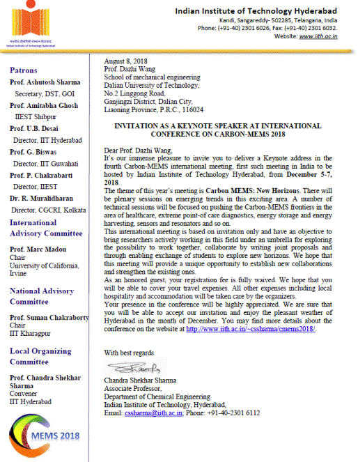 应第四届碳-微系统国际会议召集人Chandra Shekhar Sharma教授邀请,我单位王大志拟赴印度国家(地区)进行学术交流。现将该团组拟出访情况公示如下: