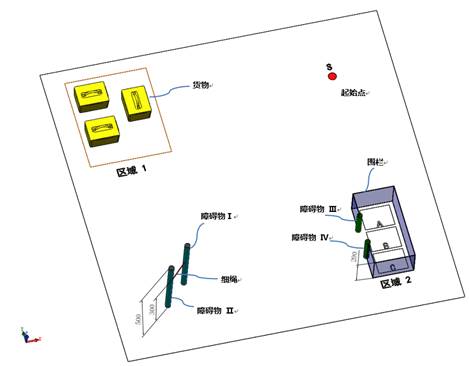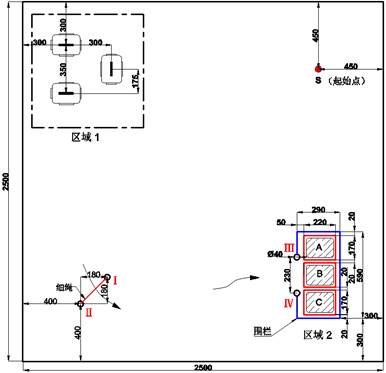(3)搬运规则:如图3所示,区域1和区域2处于一个2500mm×2500mm场地的对角。要求能在一定时间内,将区域1的三个货物(初始摆放位置如图所示)精准地搬运至区域2的A、B、C三处,不得超出边界线、就位后不得叠加,作品的安装、移动范围不得超出场地边界。在搬运过程中,货物均要从直立的障碍物Ⅰ、Ⅱ和Ⅲ、Ⅳ之间穿过而不得触碰障碍物且货物最底部离地的高度不能超过障碍物的高度。同时,在障碍物Ⅰ、Ⅱ之间距地面300mm高度处系一细绳,要求在搬运过程中,货物的底部须跃过细绳。
