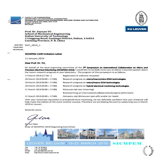 应SICMPEM 2019主席Qian Jun邀请,我单位余祖元拟赴比利时鲁汶参加5th Symposium on International Collaboration on Micro and Precision Electrical Machining (SICMPEM 2019)的学术会议。现将该团组拟出访情况公示如下: