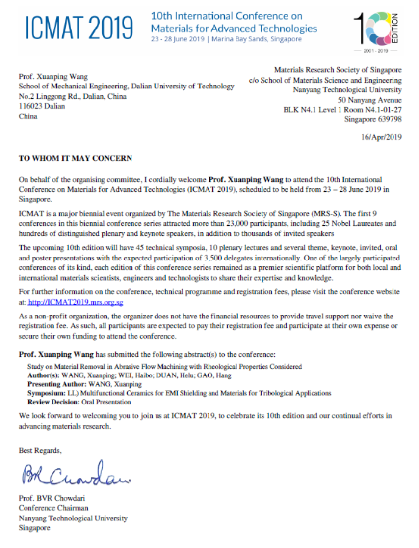 应第10届国际先进材料技术会议(ICMAT2019)会议主席 Chowdari教授邀请,我单位 王宣平拟赴新加坡国家(地区)进行工作访问(学术交流)。现将该团组拟出访情况公示如下: