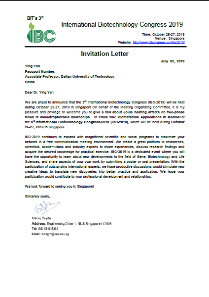 3rd International Biotechnology Congress (IBC-2019) 2019是微流控技术领域十分重要的研讨会,应大会主席Manoj Gupta邀请,我单位闫英拟赴新加坡进行学术交流。现拟出访情况公示如下: