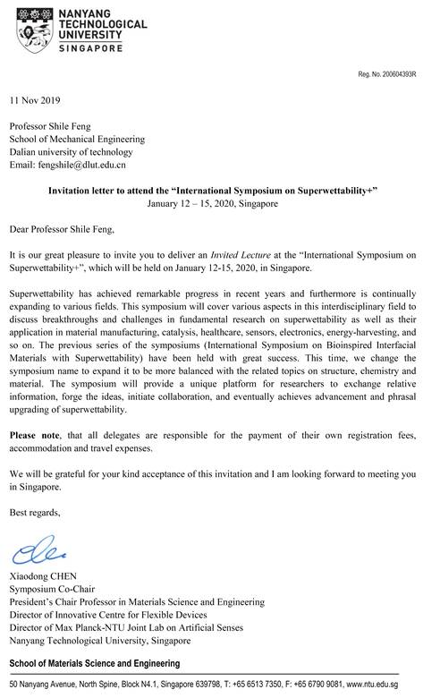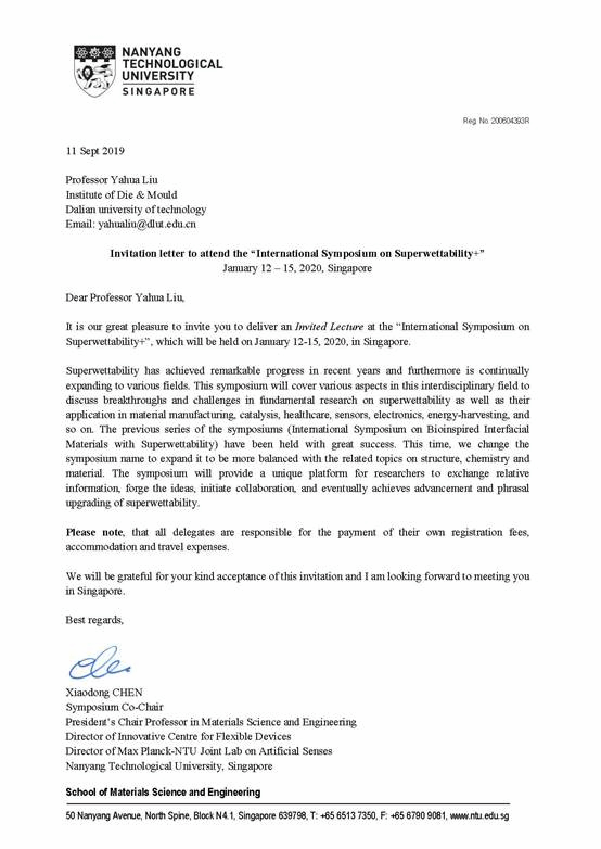 应大会主席南洋理工大学陈晓东教授邀请,我单位刘亚华、冯诗乐拟赴新加坡参加超浸润国际研讨会(International Symposium on Superwettability+)。现将该团组拟出访情况公示如下: