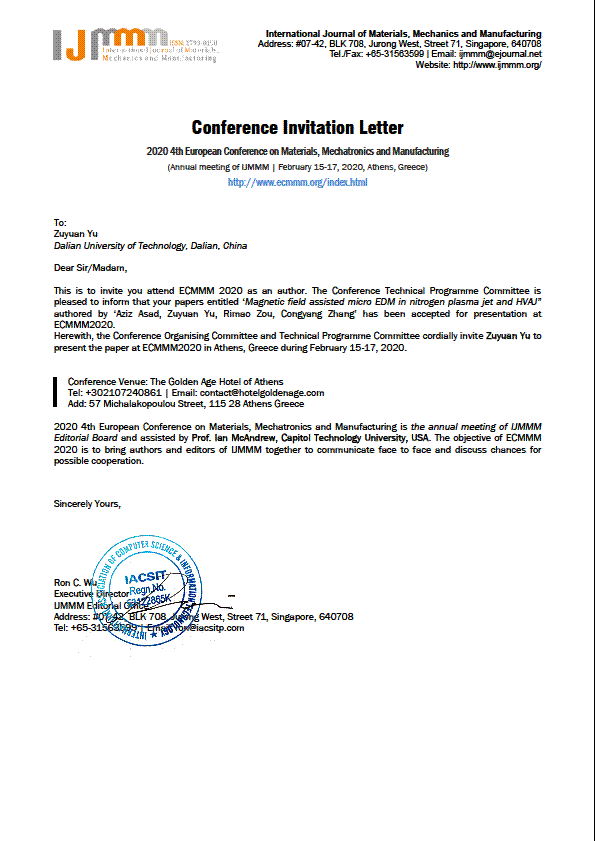 应IJMMM编辑部办公室常务主任 Ron C. Wu的邀请, 我单位余祖元拟赴希腊雅典参加第4届欧洲的材料、机电和制造国际会议( 2020 4th European Conference on Materials, Mechatronics and Manufacturing, ECMMM 2020)。现将该团组拟出访情况公示如下: