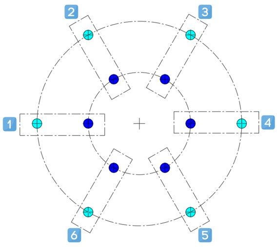 取物区:沿两个同心且半径分别为375mm和750mm的圆形中心线,分别从两个圆形标志线的最左侧开始,以60°间隔绕两圆圆心阵列6个直径54mm的圆形框(共12个)作为取物点,如图3所示。取物区共分为6个部分,如图示“1”~“6”。比赛前,依次从6个部分中的两个圆形中随机抽取一个作为物品摆放位置,共摆放6件物品。(图中颜色、虚线和数字仅供说明使用,实际比赛场地中并不存在,所有标志形状位置颜色均为白色。)