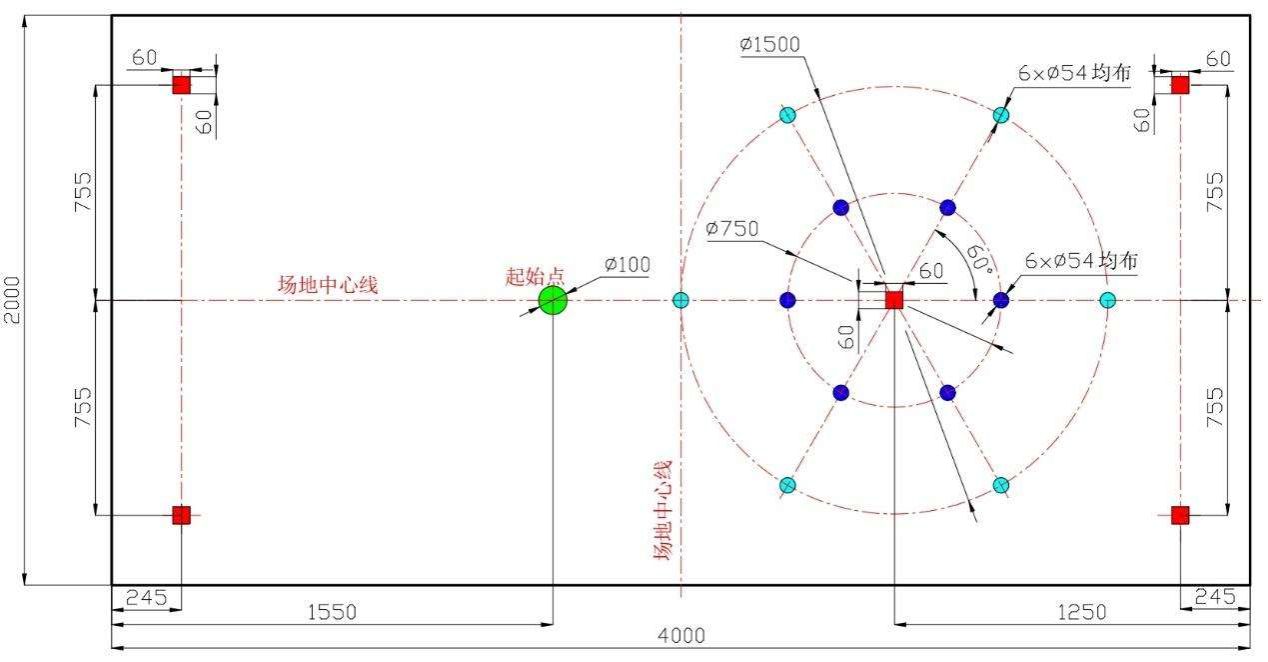 比赛整体场地布置如图2所示的矩形区域,整体尺寸2000mm×4000mm,其中:红色方形代表置物平台外框,青色和蓝色圆形代表取物点,绿色圆形代表竞赛作品取物装置的初始位置。图中颜色和虚线仅供说明使用,实际比赛场地中并不存在,所有标志位置颜色均为白色,实际比赛场地如图5所示。