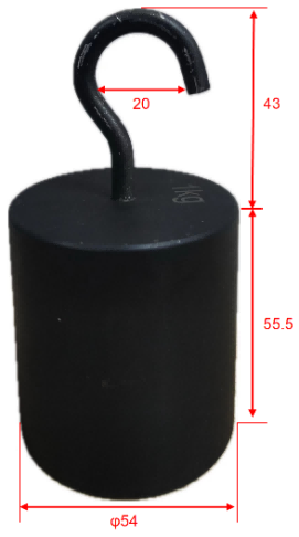 单钩砝码,如图1所示。(质量:1kg,外形尺寸:直径约φ54mm,高度约55.5mm,钩子高度约43mm,钩子开口约20mm)。(链接:https://detail.tmall.com/item.htm?_u=e36e60qh0878&id=707654227689&spm=a1z09.2.0.0.7b332e8dx3NMk7)