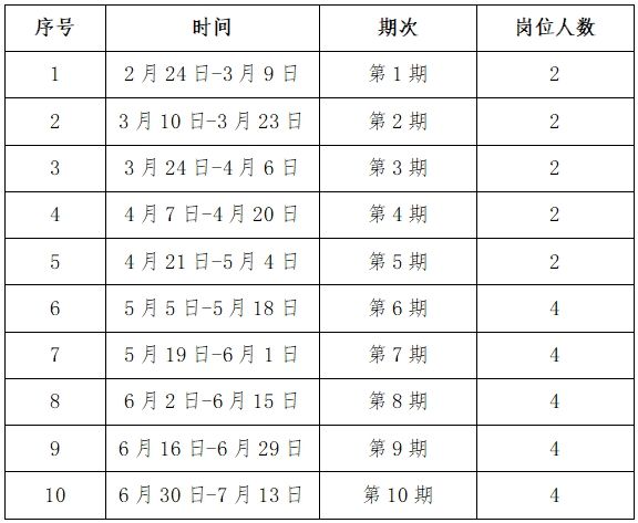 2.岗位工作周期:每两周作为一个实习周期,每人最多报名2期,将根据个人空闲时间、岗位需求综合考虑实习时间。