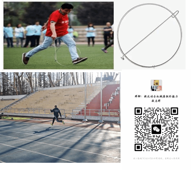 竞赛规则:采用径赛 4*100 米接力赛跑道,当听到发令后,第一名运动员手持铁钩,推动铁环在地面上滚动,人跟着滚动的铁环跑,努力保持铁环不倒,在 接力区内完成交接,直至第四名冲过终点线,按用时(少)排序。要求:(1)推铁环应尽量保证在自己的跑道内,如影响到他人的比赛,将取消比 赛资格;(2)铁环交接应在接力区内完成,允许铁环停止交接,交接完毕后不得协 助下名队员比赛。(3)推环倒地或推环失控(即环与钩远超过 30 厘米),要从失败原点重新 起跑,禁止套环,禁止钩小环。