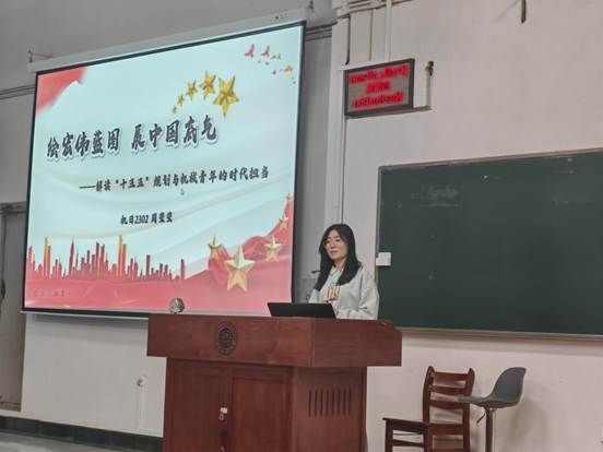 随后,周莹莹同同学带领学员们进行了一场深刻的理论学习。她首先描绘了国家未来五年发展的宏伟蓝图,接着从经济实力、科技创新、文化自信等多个维度,系统阐述了中国发展的底气所在。最后,她紧密结合机械工程的专业特点,呼吁同学们要立足专业所学,将个人发展融入国家战略需求,在新时代的伟大征程中展现机械学子的责任与担当,引发了在场学员的深入思考。