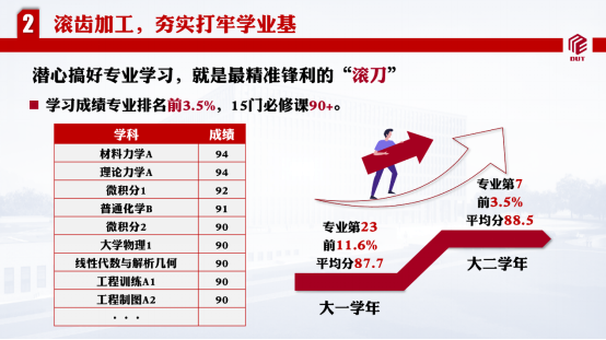 潜心搞好专业学习就是最精准锋利的滚刀。在大二学年,赵玉鑫学习成绩专业排名前3.5%;相较于大一学年进步近7%。其中理论力学、材料力学、工程制图等专业课均在90分以上。