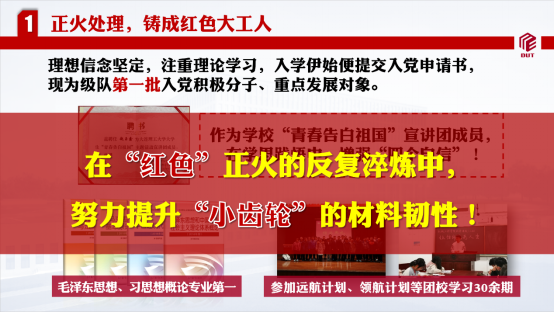 赵玉鑫从小对党组织就有深深的向往,进入大学便第一时间递交了入党申请书,不断加强理论学习,毛概、习思想概论两门课程专业第一;积极参加远航计划、领航计划等团校学习三十余期,并作为学校“青春告白祖国”宣讲团成员,在学思践悟中增强“四个自信”,在“红色”正火的反复淬炼中,努力提升小齿轮的材料韧性。