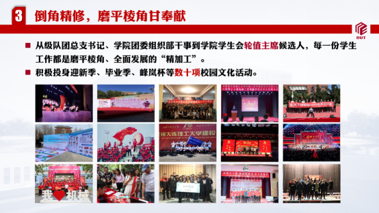 从级队团总支书记、院团委组织部干部到学院学生会轮值主席候选人,每一份学生工作岗位的经历都是磨平棱角、全面发展的“精加工”。赵玉鑫积极投身迎新季、毕业季、运动会、峰岚杯等数十项校园文化活动,尤其是新冠肺炎疫情爆发以来,策划开展战疫系列原创诗歌巡礼、创意工图作品迎校庆、家庭晚自习“云”打卡等机械特色线上活动,切实将机械青年的思想统一到坚决打赢疫情防控攻坚战上来,将行动聚焦到停课不停学、学习不松懈上来。