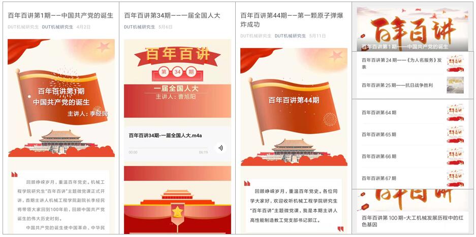 为教育引导广大研究生深刻铭记中国共产党百年奋斗的光辉历程,学习传承中国共产党在长期奋斗中铸就的伟大精神,从党的百年伟大奋斗历程中汲取继续前进的智慧和力量,机械工程学院邀请百名师生开展“回顾百年荣光”研究生“有声微党课”活动,活动自2021年3月起策划制作,已完成100期。