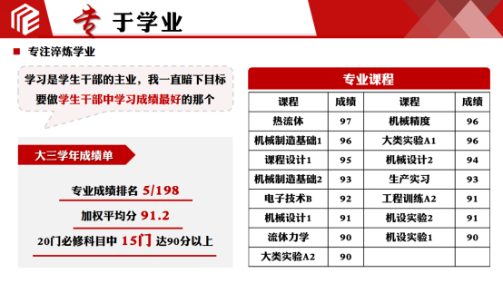 身边人说学生干部啥啥都行,就是学习差点意思。邸宏宇便一直暗下目标,不能被这么“打脸”。这一年他和时间赛跑,早起一会儿、晚睡一会儿、干完活动再学一会儿。最终,在机械大三“众神林立”的20门必修科目中,15门达90分以上,平均分达91.2。