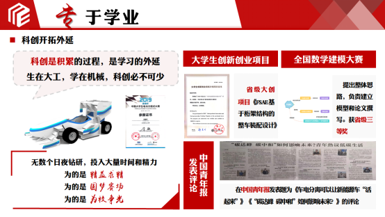生在大工,学在机械,科创必不可少,他作为学校凌魂车队的骨干成员,参与5辆方程式赛车的设计与制造,在大量的工程实践中积累了宝贵经验。曾两次在中国青年报发表评论,得到热烈反响。