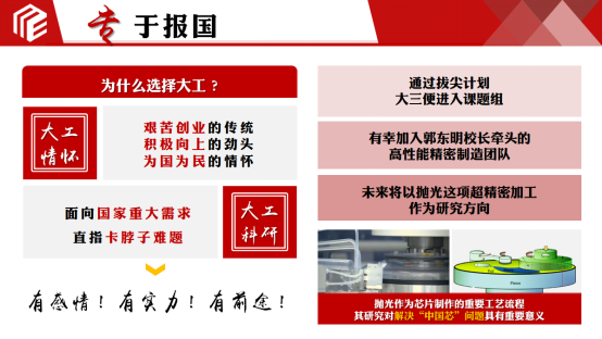 当问到他为什么选择大工时,他是这样说的:“身边的同学得他们选择的可能是更好的城市、更知名的学府,而我选择的是给了我思想、教会我做人、提升我本领的大连理工。我非常有幸加入郭东明校长牵头的高性能精密制造团队,这将是我大工梦的新开端,未来将致力于解决国家的卡脖子难题,成为中华民族伟大复兴伟大丰碑上的一块红砖,而且甘做不露脸的地基砖。”