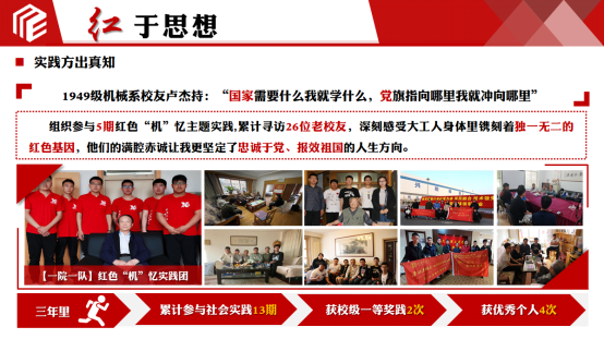 三年里,邸宏宇用实际行动去探寻大工红色基因,开展五期红色“机”忆主题实践,累计寻访优秀校友26人,49级校友卢杰持的那句“国家需要什么我就学什么,党旗指向哪里我就冲向哪里”的满腔赤诚更坚定了他忠诚于党、报效祖国的人生方向。