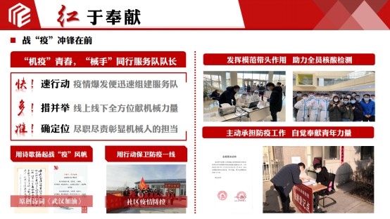 他一直担任学生骨干,作为学院团委常务副书记、班级团支书,邸宏宇始终将服务奉献的工作宗旨根植于心,主讲理论学习二十期、组织开展三级团校十二期,组织迎新、峰岚等多项工作,尽心服务校园文化建设。服务永不褪色,现在,他还积极担任机2103班班导生,努力发挥余热,把学校、学院的喜事、大事传达给新生,让正能量成为新生班级的主旋律。