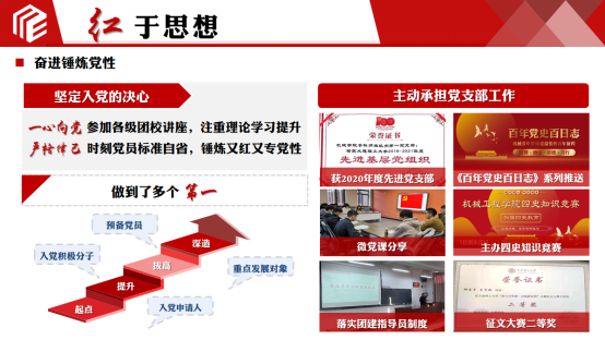 邸宏宇一心向党,18岁生日当天便递交了入党申请书,成为了2018级第一批积极分子、第一批重点发展对象、第一批预备党员。入党后,他主动承担党支部工作,助力支部获得创新立项校优秀项目,获评校先进基层党组织。为献礼建党百年,与支部成员共同接力,连续100天推出“百年党史百日志”党史故事分享,同时代表支部参加校党委征文大赛并获奖。