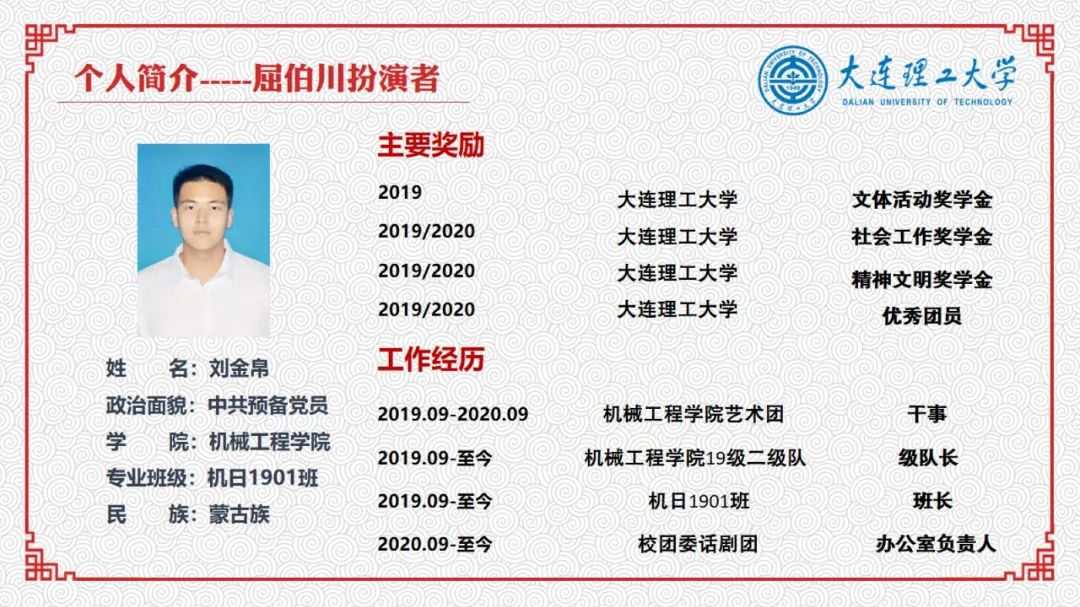 刘金帛,中共预备党员,机械设计制造及其自动化(日语强化)专业2019级本科生,现任话剧团办公室负责人,话剧团主要演员,第九代屈伯川扮演者,同时担任机械工程学院2019级二级队级队长、机日1901班班长职务。