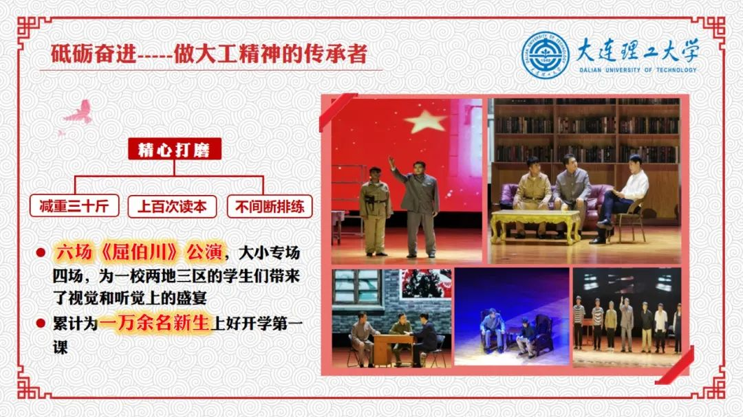 入学之初,还在军训的他通过迎新晚会话剧《启航》,开始了他在大工的文艺之路。是那时候他还不知道,台词中一遍又一遍重复的大工精神到底是什么。加入话剧团后,他开始逐渐了解校史话剧《屈伯川》,也逐渐明白了以屈伯川为代表的老一辈大工人留下来的大工精神。第八代屈伯川扮演者戴相承学长曾对他说,我并不是扮演一个角色,而是在代表一种精神,那就是大工精神。这句话深深地刻在他的脑海里,为了更好地完成话剧的表演任务,他用一年的时间减重三十斤、用一年的时间把剧本读上百次、用一年时间打磨细节,只为在舞台上用两个小时向大工的师生讲述我们母校的建校历史,弘扬老一辈大工人留下来的大工精神。“烛火不灭,大工精神不灭”,当这句台词响彻在剧场,大工精神通过他的声音和表演,传递给了在座的每一位新生观众。之后,他成为了第九代屈伯川扮演者。在大学三年内,他先后完成六场《屈伯川》公演,大小专场四场,为一校两地三区的学生们带来了视觉和听觉上的盛宴,并通过演出深刻体会了屈老院长创校的艰辛和大工的红色基因,并用自己的表演生动地传达给了每一位看过《屈伯川》的学生们,将老一辈大工人为教育事业奋斗终身、为祖国奋斗终身、为党奋斗终身的故事讲述给新生,为新生上好开学第一课。