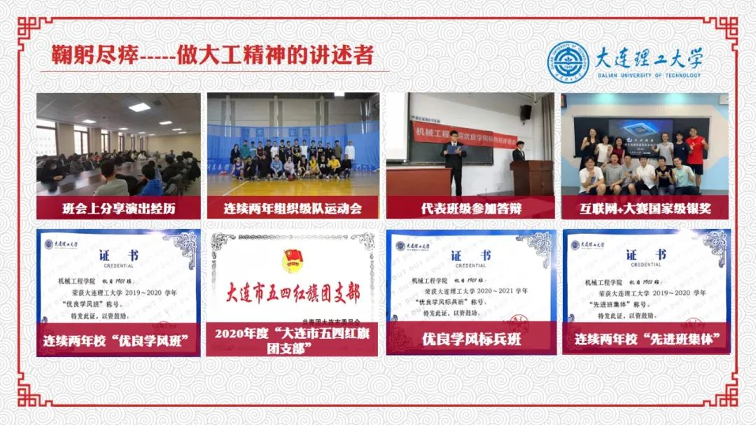 在话剧《屈伯川》中的演出经历,不但让他了解到母校的建校历史,更让他获得了以屈伯川院长为代表的老一辈教育家留下来的宝贵的精神财富。屈伯川院长为教育事业鞠躬尽瘁的精神,促使他在日常工作中对班级的奉献。他定期带领同学一起探讨理论知识,帮助同学们共同进步;组织丰富多彩的课外活动,弘扬校园文化。在班会中,他多次向班级同学们讲述大工的校史,并分享他的演出经历和感悟,以实际行动传承和弘扬大工精神。同学们在一次次分享会中深受鼓舞,班级同学们将海纳百川、自强不息、厚德笃学、知行合一的大工精神践行到自己的日常学习生活中。在他的带领和影响下,机日1901班成为了一个思想积极、学术氛围浓厚、全面发展的班集体,获得了包括大连市五四红旗团支部、大连理工大学优良学风标兵班、先进班集体在内的众多荣誉。