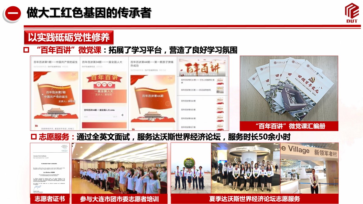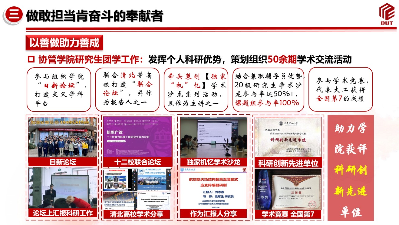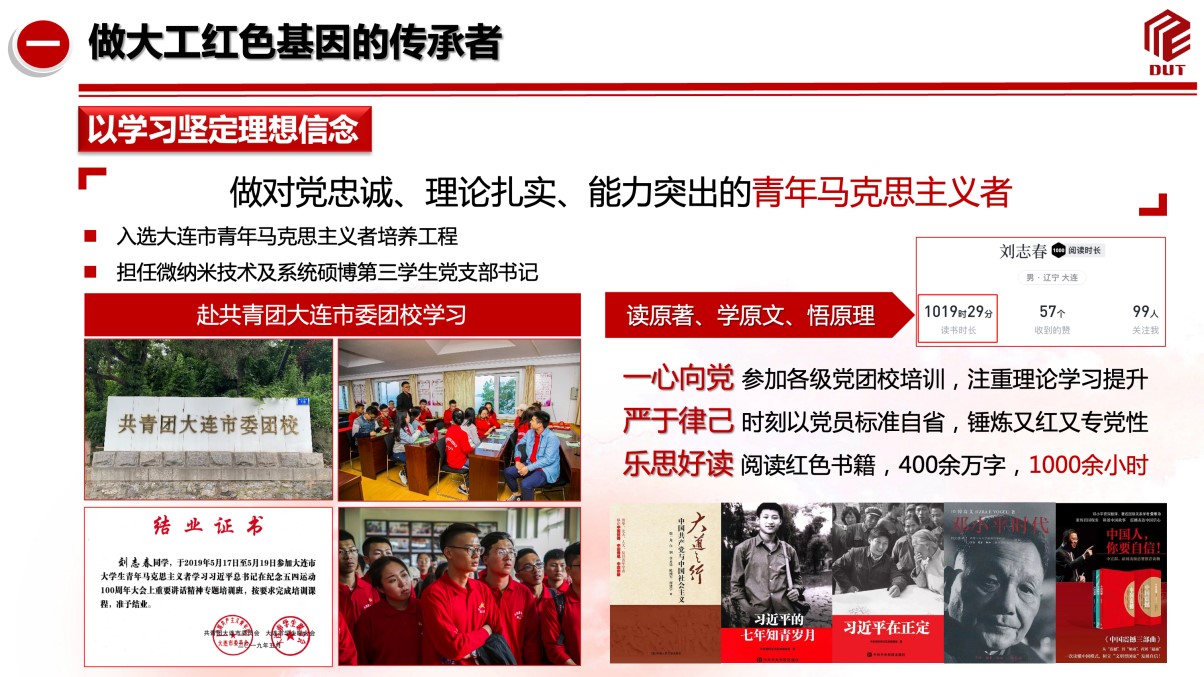 他始终坚定理想信念,曾入选大连市青年马克思主义者培养工程,以初心指引人生航路,立志潜心科研、矢志报国,做大工红色基因的传承者。