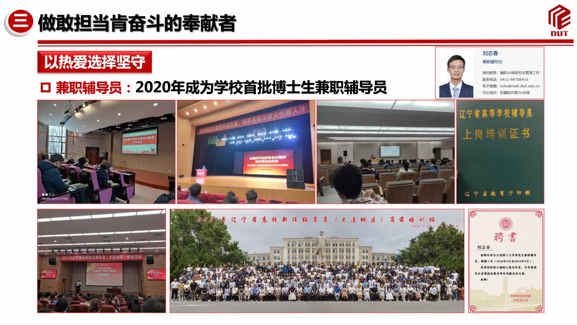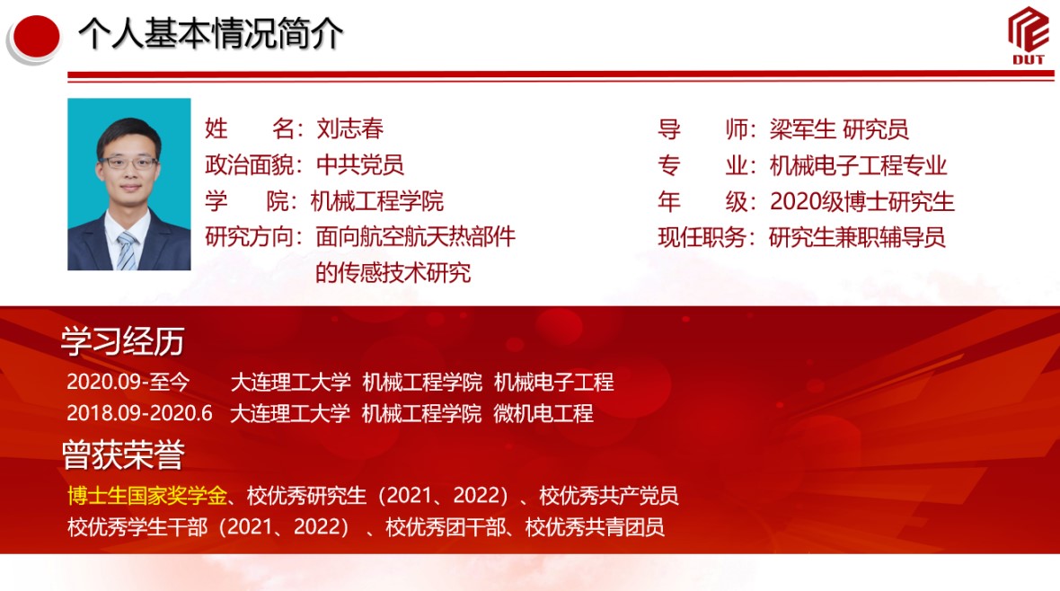刘志春,2020级机械电子工程专业博士研究生,现任博士生兼职辅导员。在校期间,他曾获得博士生国家奖学金、优秀研究生等荣誉10余项,始终不忘传承大工红色基因,练就过硬本领,坚持思想过硬、学术过硬、责任过硬,锻造硬核机械青年!