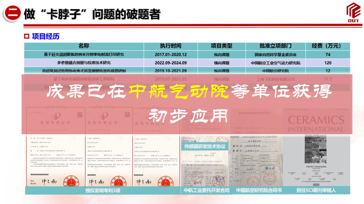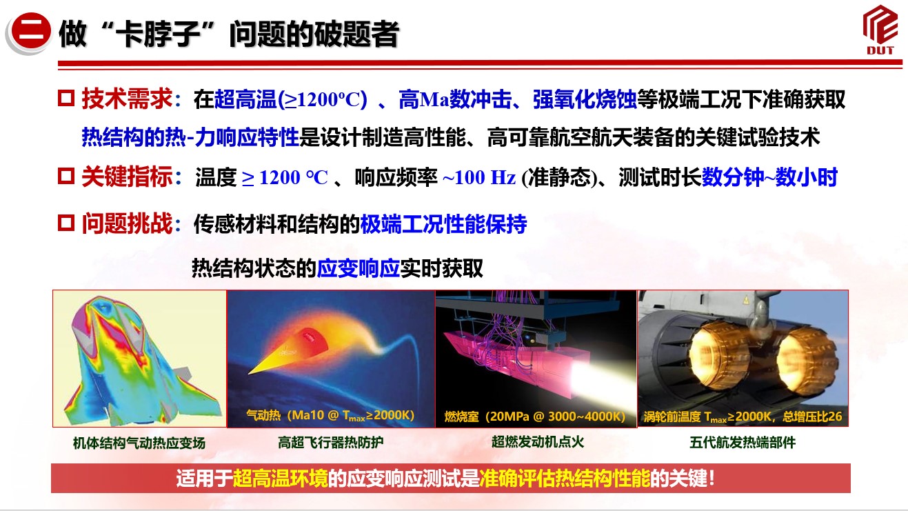 他坚持钻研“卡脖子”问题,针对空天装备热端部件在超高温(≥1200 ℃)等极端工况下难以获取其热-力响应特性难题,探索开发了可服役于超高温等极端工况的高可靠关键传感技术。