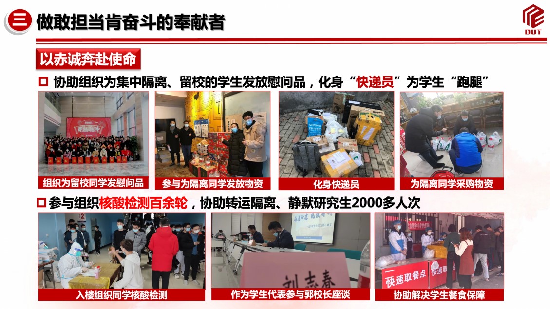 以赤诚奔赴使命。疫情期间,他化身“快递员”,为隔离研究生发放慰问品,“跑腿”传递必要物资,全流程参与返校报到、核酸检测、静态管理等各项工作,组织核酸检测百余次,协助转运、静默管理研究生2000余人次,以实际行动彰显青年担当。