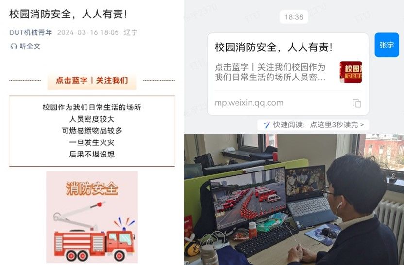 学院始终注重教育引导,面向全体本科生、研究生多渠道开展教育宣传工作,保障安全教育全覆盖。通过微信群、钉钉群、QQ群等方式分享消防安全知识;依托学院“DUT机械青年”微信公众号发布《校园消防安全,人人有责!》推送,面向全体学生讲解消防安全注意事项,普及逃生小知识,并积极转发宣传;组织学生观看“2024年春季学校火灾疏散逃生演练公开课”,提升安全意识,做好安全防范。